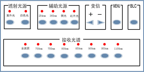 當(dāng)要顯示票證上熒光暗記、圖案時(shí),按動(dòng)激發(fā)多波段光源按鈕,選擇合適波段的光源,這樣可獲得紫外熒光效果。